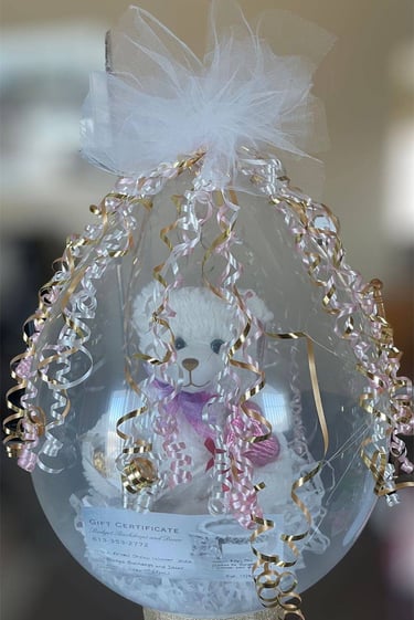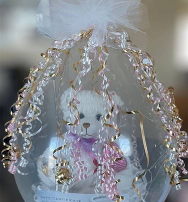 Nothing is more fun for the recipient than seeing a creation made by us and then popping it to get their gifts! We can customize these for weddings, birthdays, get well, anniversaries, teachers, holidays, and events. We can stuff money, gift cards, wine, alcohol, plush toys, candy & snacks, live or artificial flowers! Even t-shirts and soccer balls! We can add a variety of "toppers" to make your gift as unique as the person sending/receiving.